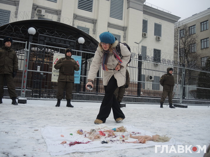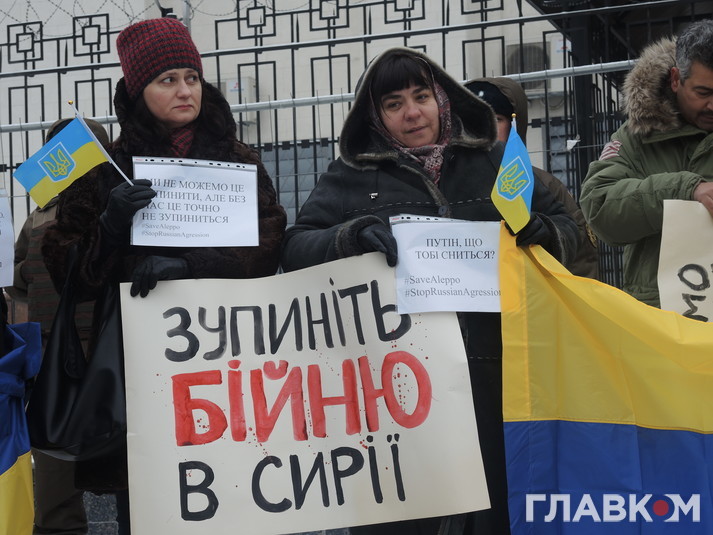 У Києві під стінами посольства Росії відбулася акція протесту проти злочинів режиму Башара Асад та його союзників з РФ у сирійському Алеппо