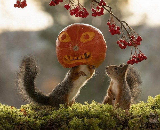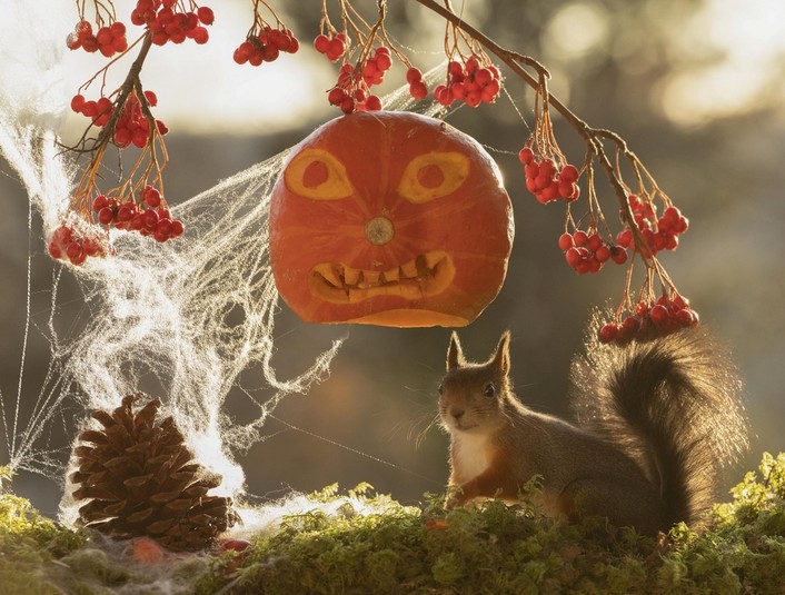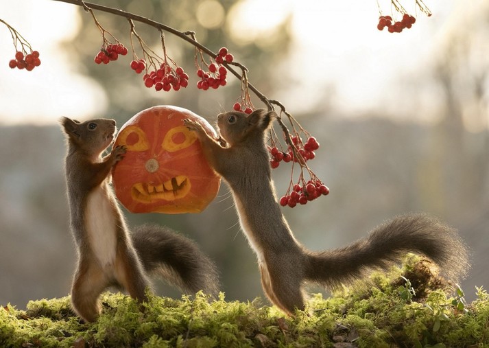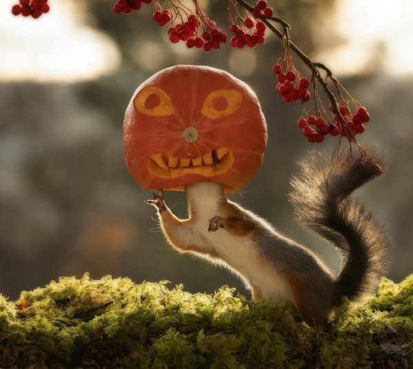 Для фотосесії до Хеллоуїну Герт повісив невеликий гарбуз в лісі і спостерігав, як білки вивчали цей предмет.