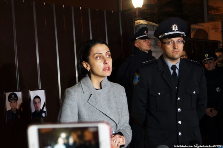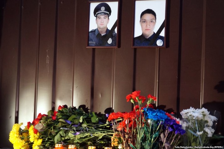 Біля фотографій загиблих 36-річної Ольги Макаренко та 27-річного Артема Кутушева стоїть варта колег-поліцейських. Державний прапор над управлінням патрульної поліції Дніпра приспустили.