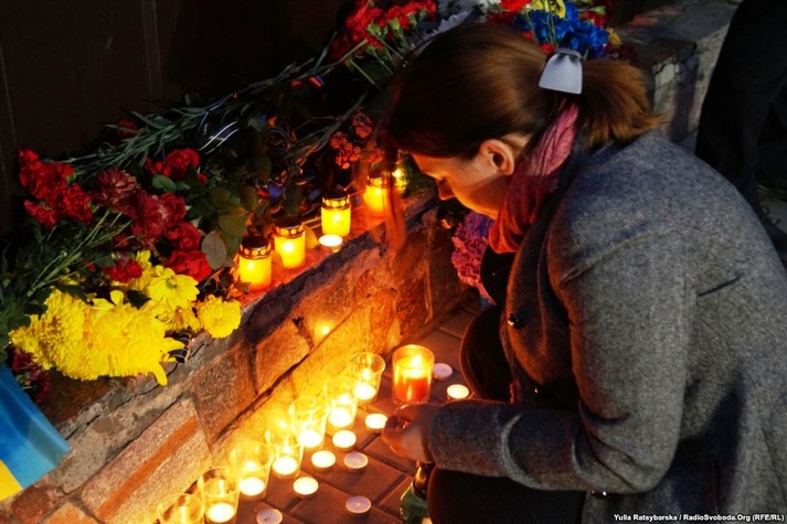 До стіни, де розміщені портрети загиблих, люди несуть квіти і запалюють свічки.