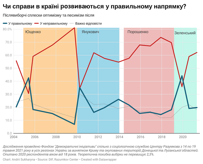 Результати опитування, ініційованого Фондом «Демократичні ініціативи» імені Ілька Кучеріва спільно з соціологічною службою Центру Разумкова, показали, що більшість респондентів дотримуються думки, що країна розвивається у неправильному напрямку (62%).