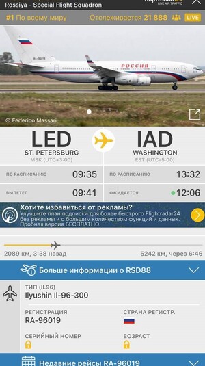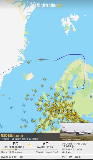 Літак Іл-96-300 з бортовим номером RA-96019 зараз здійснює переліт з Санкт-Петербурга до Вашингтона, незважаючи на те, що небо США закрите для російської авіації.