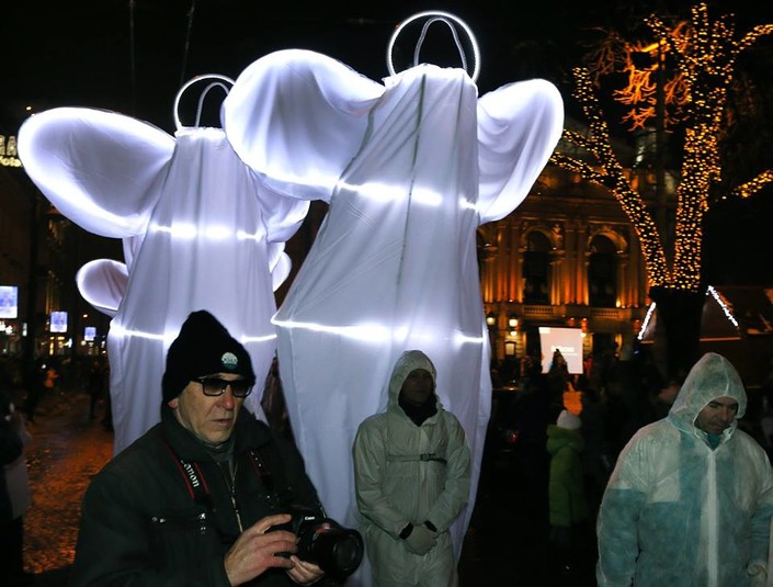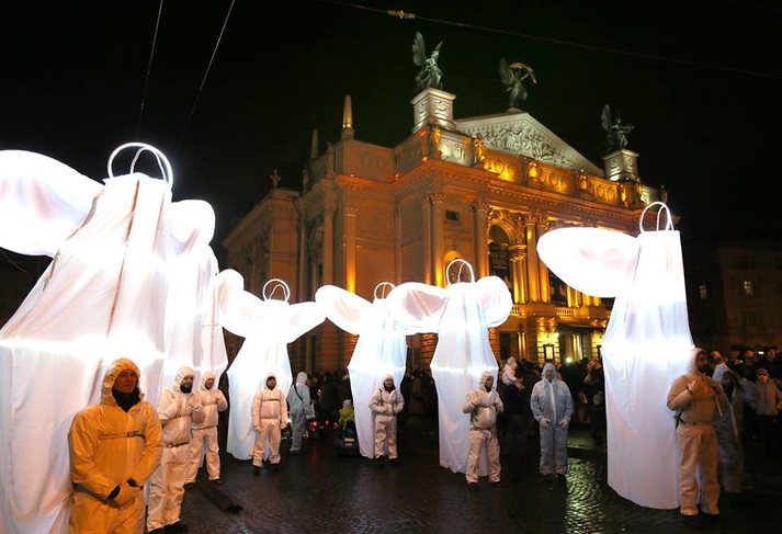 Львівський духовний театр «Воскресіння» підготував вуличну міні-виставу з використанням великих фігур ангелів…