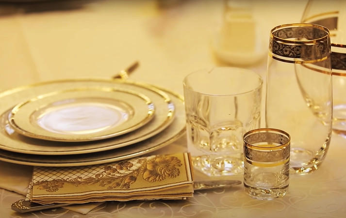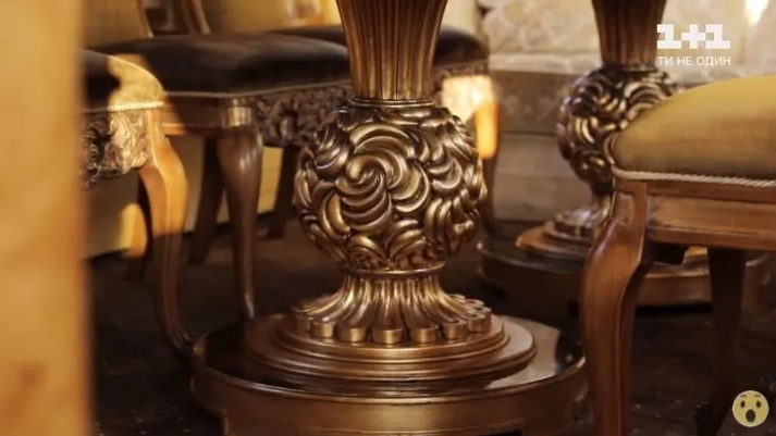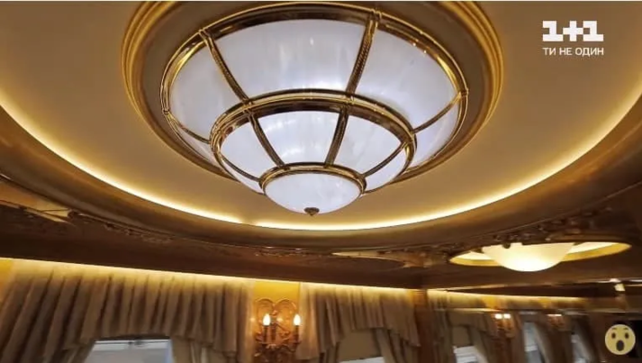 Всередині все оформлено, як-то кажуть «по-багатому» – люстри, портьєри, ліплення – все в золоті. Обід і вечеря подається на розкішному посуді, звичайно ж з елементами позолоти.