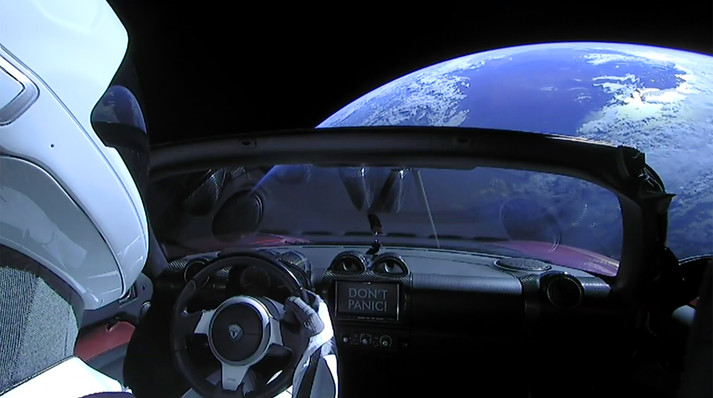 На приладовій панелі машини міститься напис Do not Panic, а з динаміків грає пісня Space Oddity Девіда Боуї.