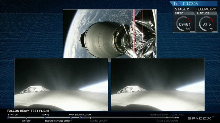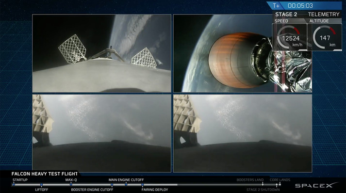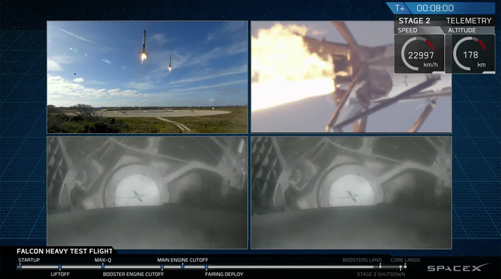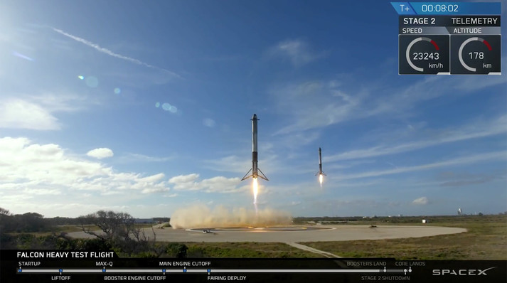 Прискорювачі Falcon Heavy, як і було заплановано, після запуску успішно повернулися назад. Два бічних прискорювача приземлилися на мисі Канаверал, виконуючи, за словами глави SpaceX, «синхронний пілотаж», пише ВВС.