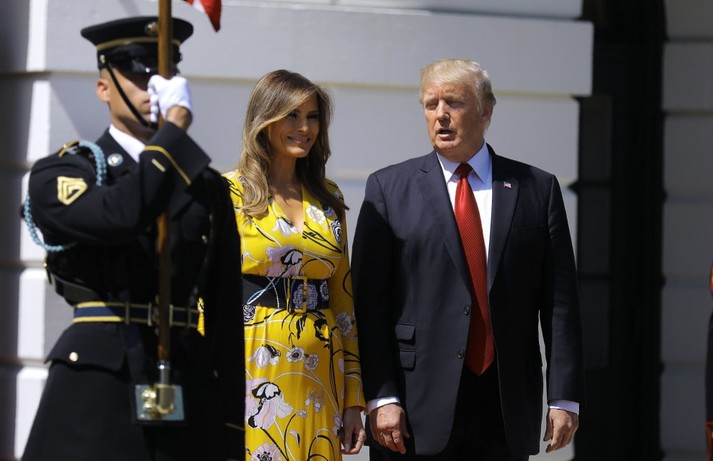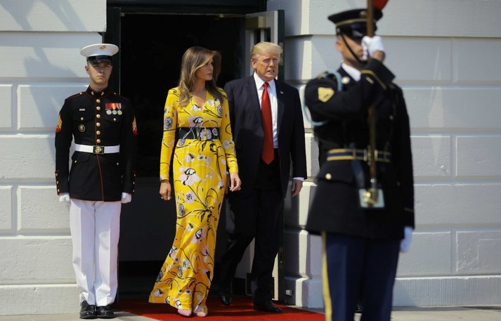 Місіс Трамп постала на офіційній зустрічі в підперезаній максі-сукні з пікантними розрізами збоку. З особливостей - яскраво-жовтий колір і флоральний принт. Авторство сукні належить модному італійському бренду Emilio Pucci.