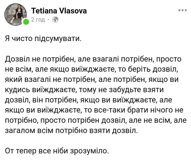 Координатор руху адвокатів Збройних сил України Євгенія Рябека пояснила, що у повідомленні Генерального штабу йдеться виключно про впорядкування обліку осіб, які змінюють саме місце проживання, місце реєстрації. Для виїзду з міста, з області, з села до села чи з району до району такий дозвіл брати не треба.