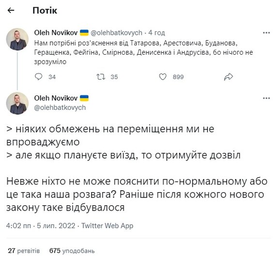 Представник Головного управління персоналу Генерального штабу ЗС України полковник Олександр Хлись повідомив, що для виїзду за межі областей військовозобов'язані мають отримати дозвіл у Територіального центру комплектування та соціальної підтримки.
