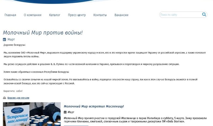На сайті компанії «Молочний світ» вийшла заява, яка засуджує російську агресію.