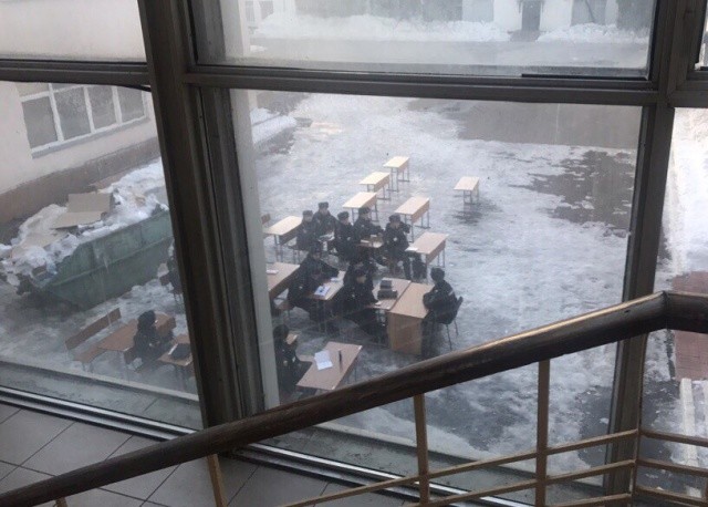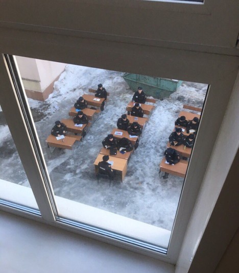 Студентам Московського університету МВС Росії імені В. Я. Кікотя провели заняття, встановивши парти на вулиці при температурі повітря нижче нуля. На фотографіях, зроблених в навчальному закладі, видно, як 16 курсантів сидять за партами зі своїми зошитами.