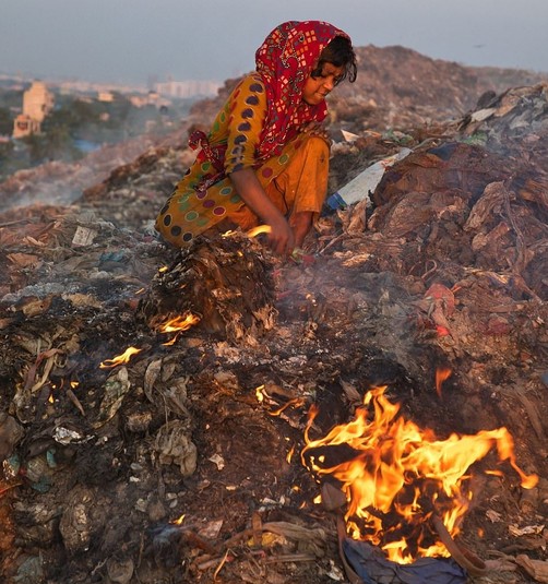 Знедолені бангладешські діти хоробро пробираються через купи сміття, яка палають, щоб знайти предмети для продажу