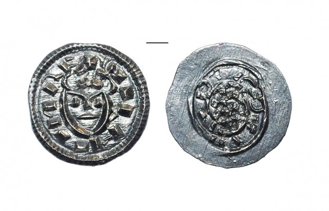 Закарпатські археологи знайшли середньовічну монету, яка була у майже відмінному стані, певно в обігу зовсім не була. На аверсі по колу надпис схожий на CALMAN RE(X).