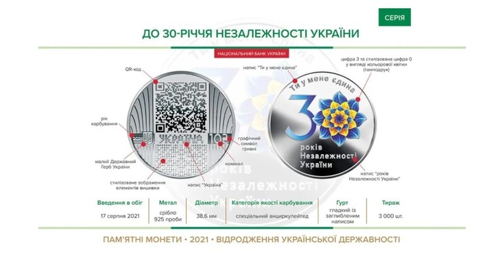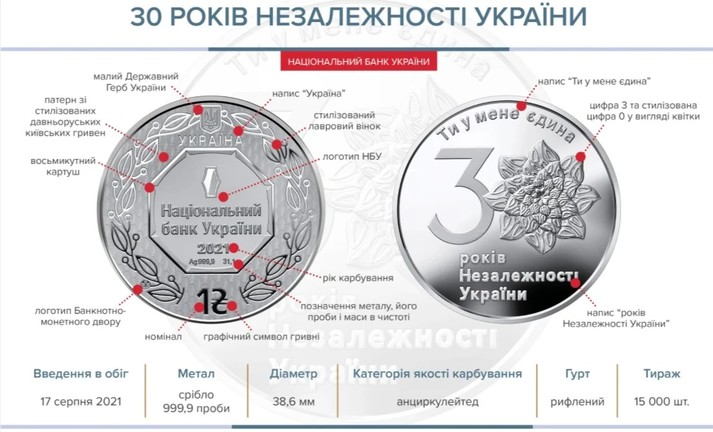 З 17 серпня Національний банк вводить у обіг чотири пам’ятні та одну інвестиційну монету, присвячені 30-річчю незалежності України. Про це йдеться на сайті НБУ.