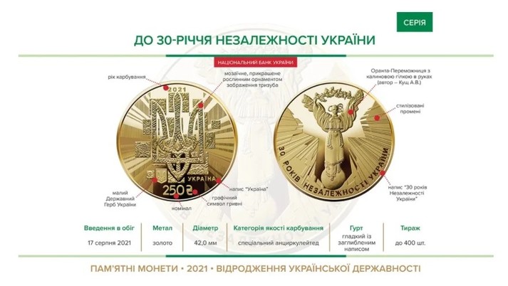 В обіг вводиться золота пам’ятна монета номіналом 250 грн, вагою 62,2 г, тираж – 400 шт. Приблизна ціна становить 140 тис. грн.