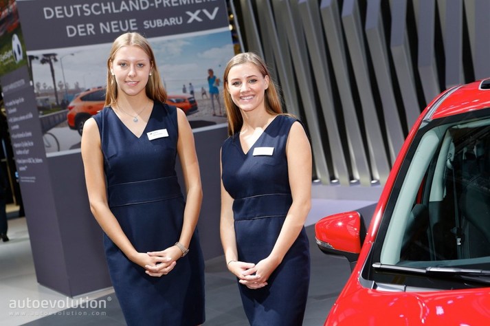 Традиційно на подібних заходах присутні дівчата-стендистки. Довгоногі красуні привертають увагу чоловіків та фотографів не менше за автомобільні інновації.