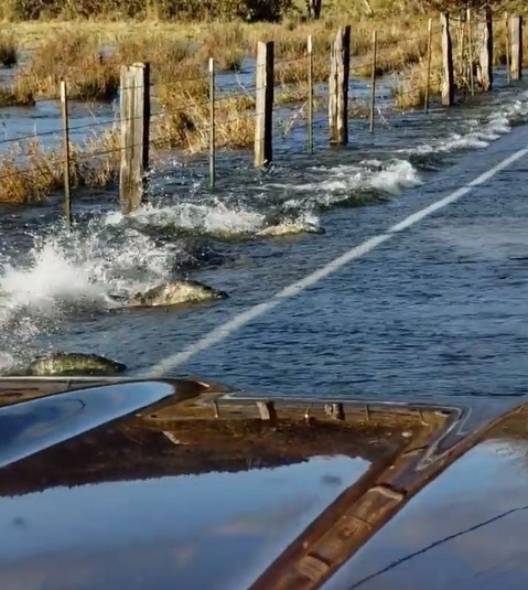 Поверхня дороги була покрита всього декількома сантиметрами води, але цим скористався лосось, який бадьоро перепливав через дорогу.