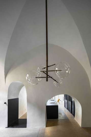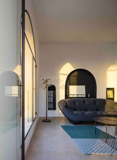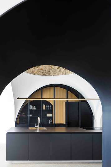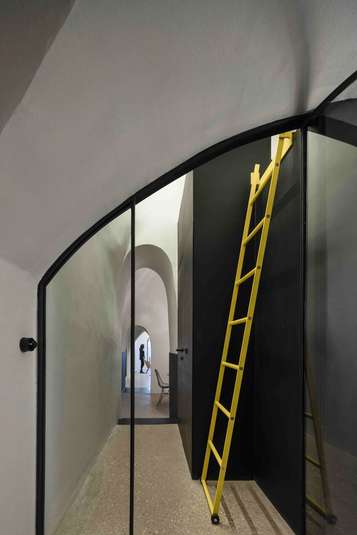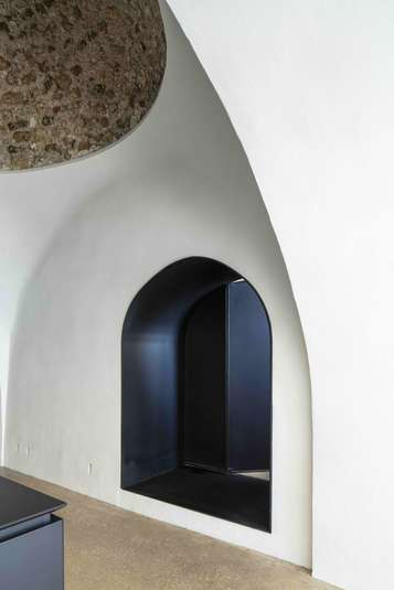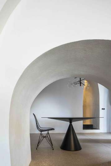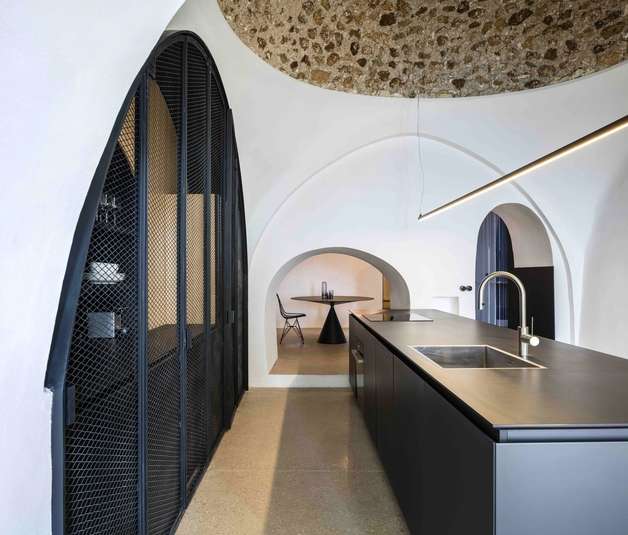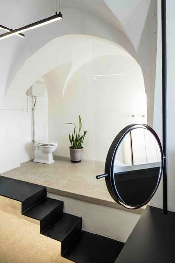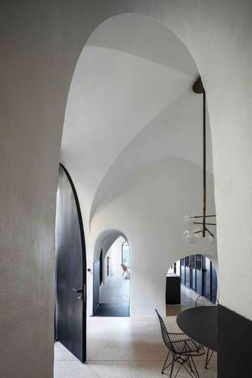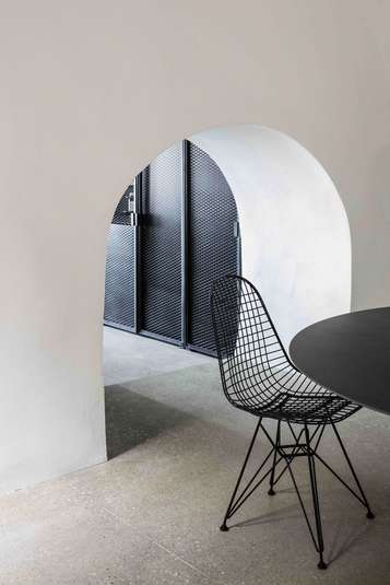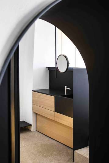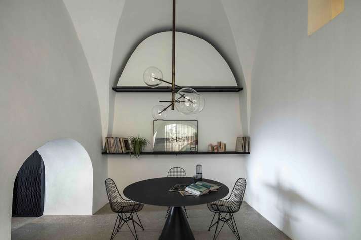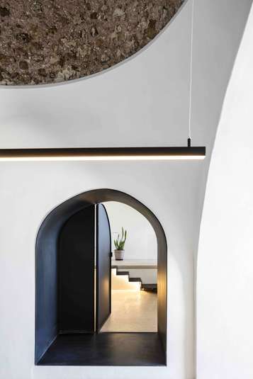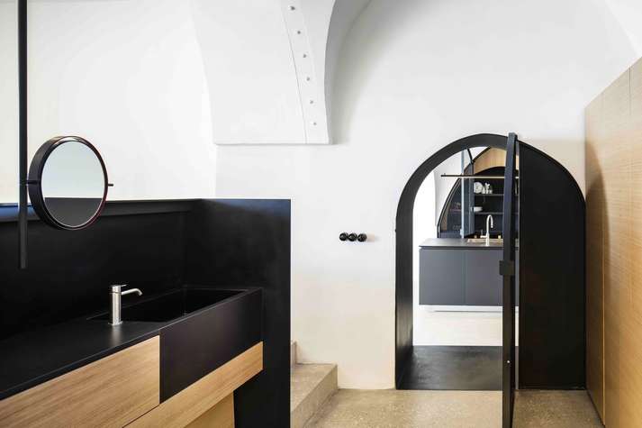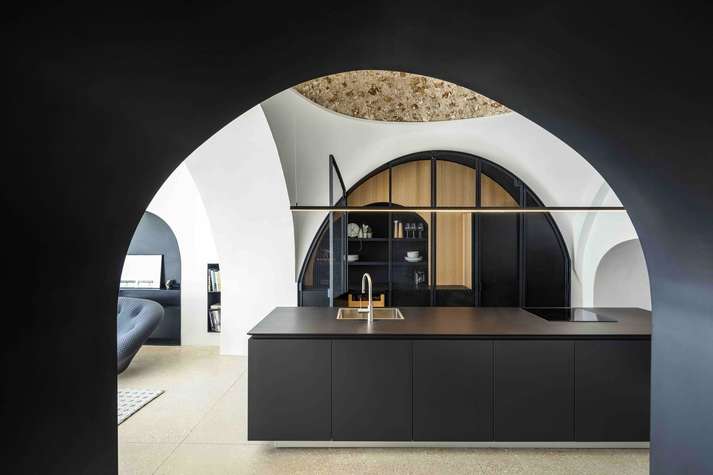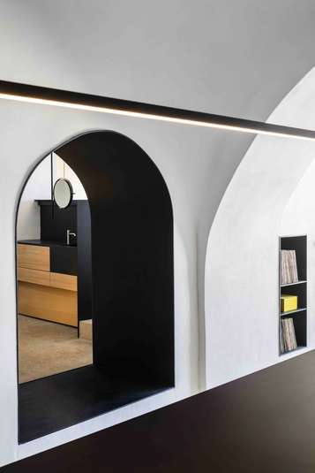 У квартирі навмисно немає дверей, за винятком лише ванної кімнати - все арочні отвори акцентовані чорним кольором.