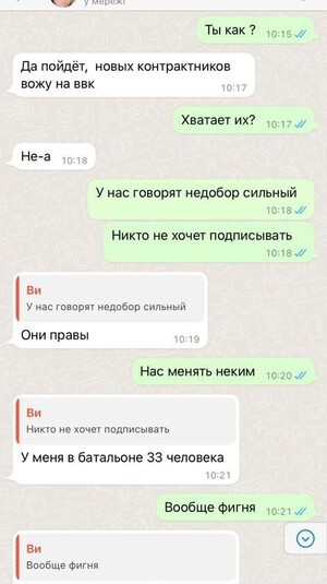 «Недобор сильный. Никто не хочет подписывать. У меня в батальйоне 33 человека (батальйон налічує у середньому 500 військовослужбовців – прим.)» – пише жінка.