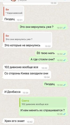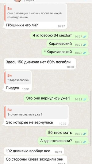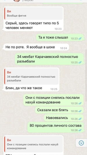 «34 мехбат Карачаевский полностью разъ*бали. 80% личного состава уничтожили. Они с позиции снялись, послали на*уй командование. Сказали: все, бл*дь, навоевались», – пише окупант.
