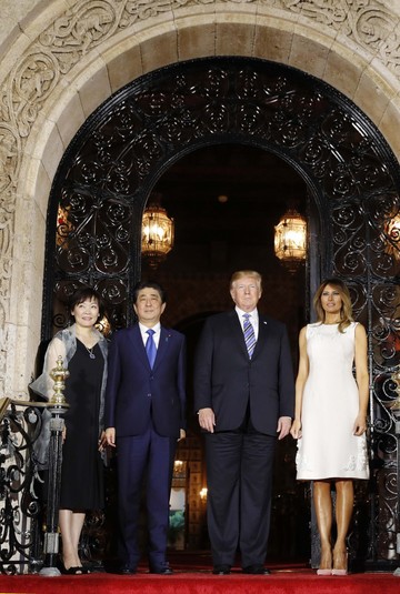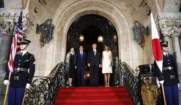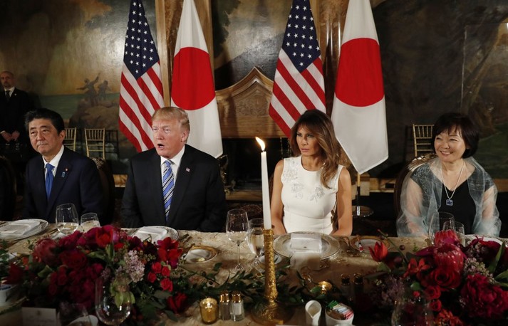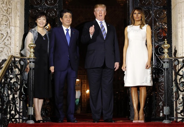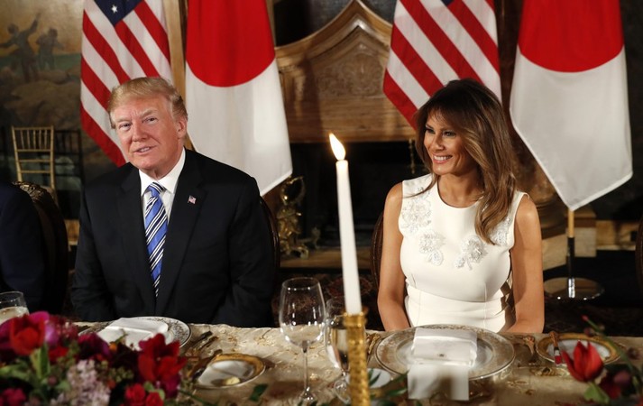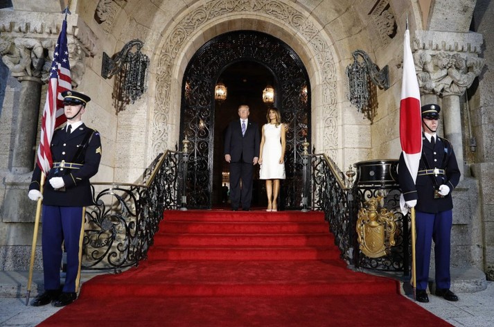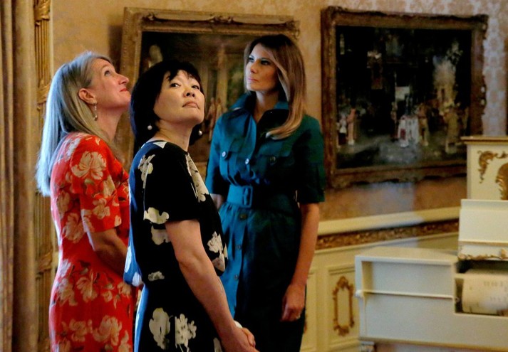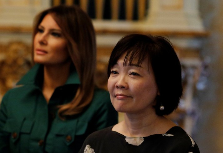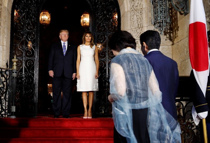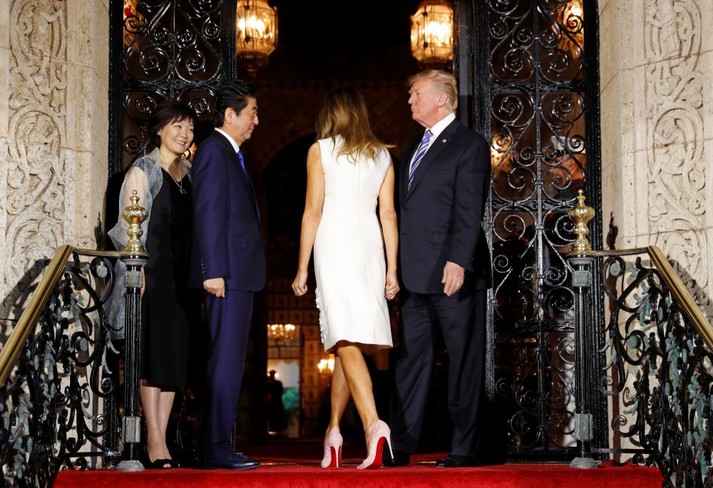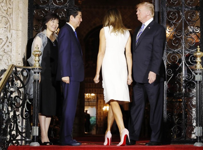 Меланія на зустріч з прем'єром Японії одягла світлу сукню з квітами, розшиту бісером, і блискучі туфлі Christian Louboutin