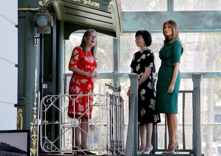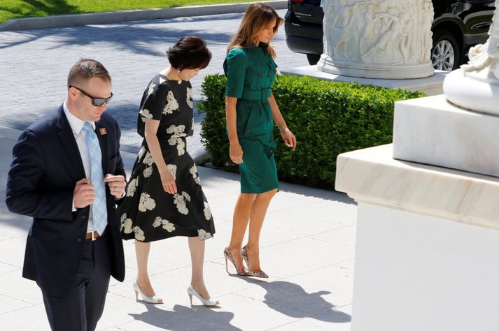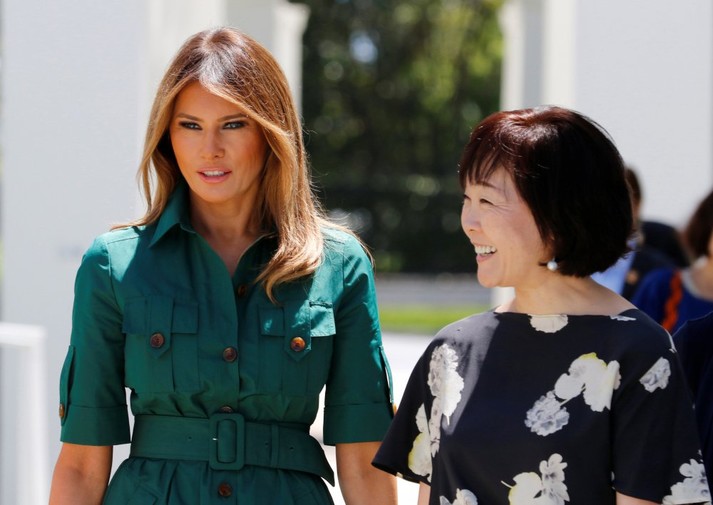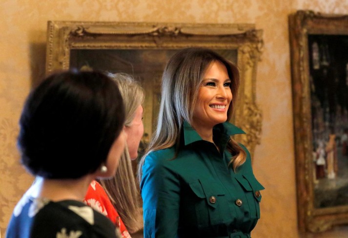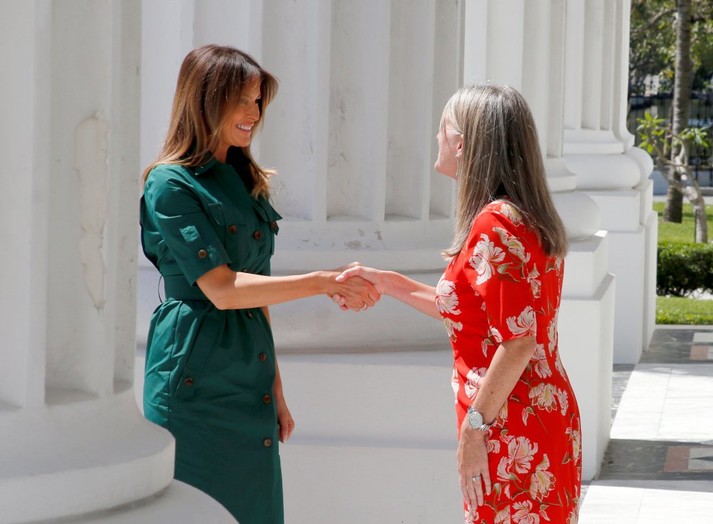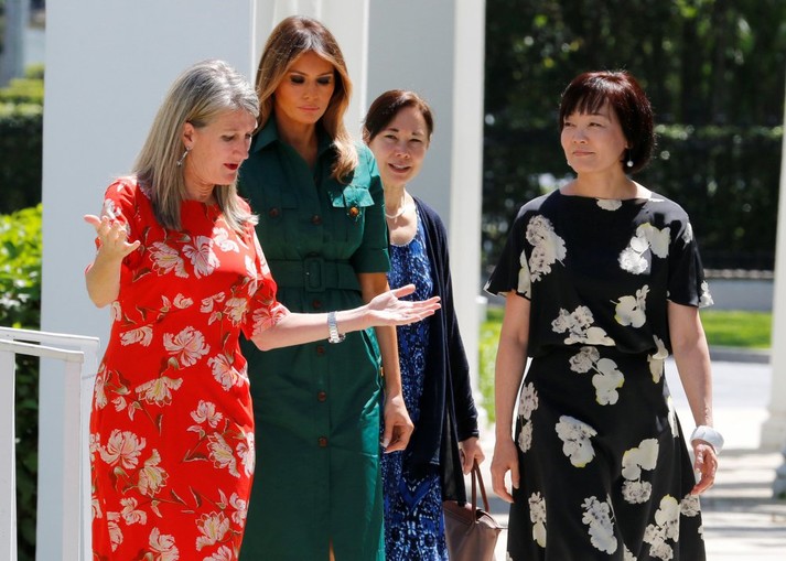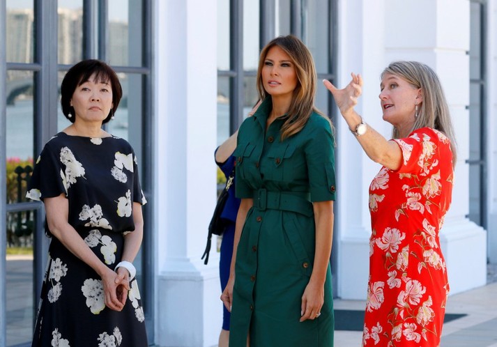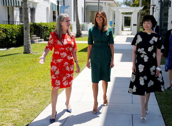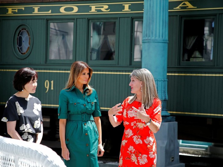 Меланія цього разу віддала перевагу зеленій сукні сорочкового крою з поясом на талії американського бренду Derek Lam. Свій образ вона доповнила туфлями-човниками Christian Louboutin зі зміїним принтом. Виглядала вона на цей раз в міру строго і в той же час не дуже офіційно.