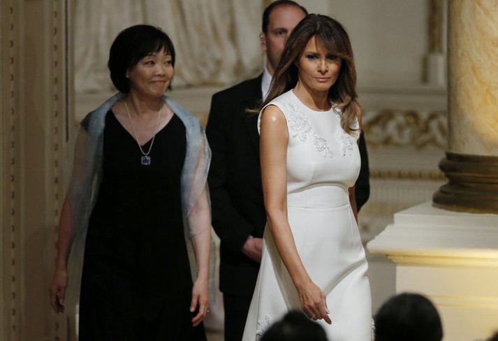 Вже ввечері, коли Дональд і Меланія Трамп влаштували урочисту вечерю, дружина президента США з'явилася в абсолютно іншому образі - ніжному і романтичному. Вона одягла світлу сукню з квітами, розшиту бісером, і блискучі туфлі Christian Louboutin.