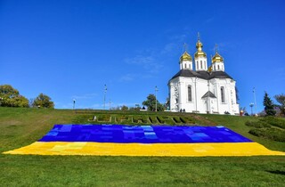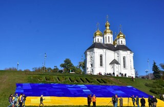 Величезний синьо-жовтий прапор України розгорнули на в’їзді до міста поблизу Катерининської церкви.