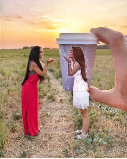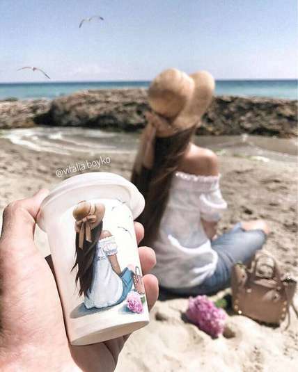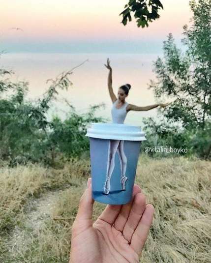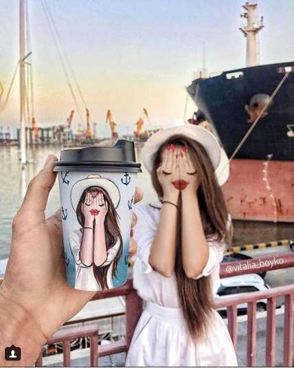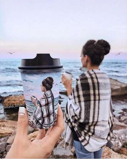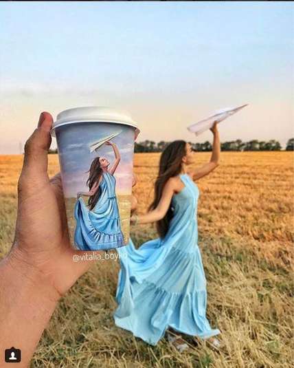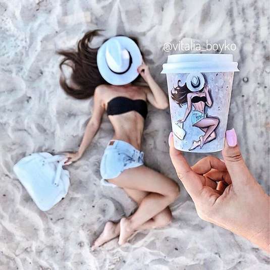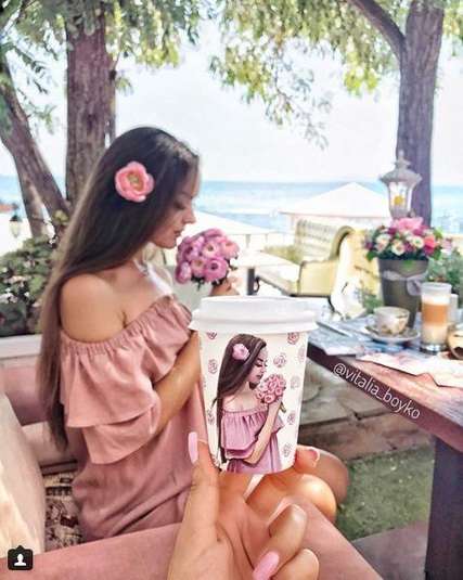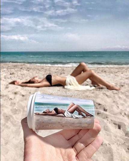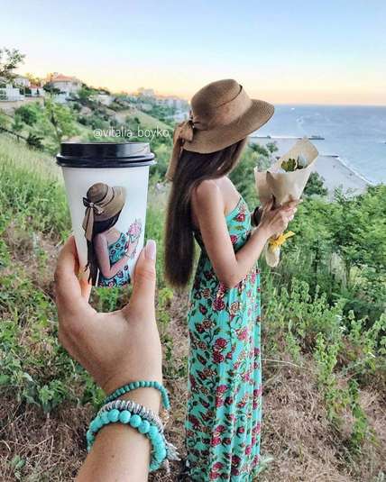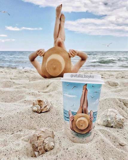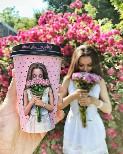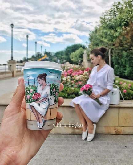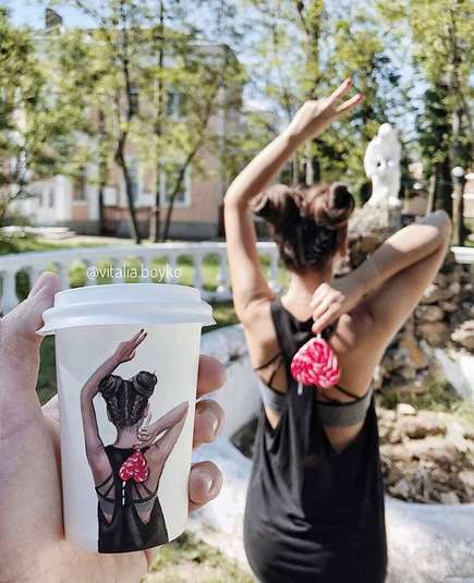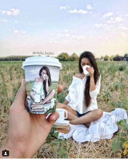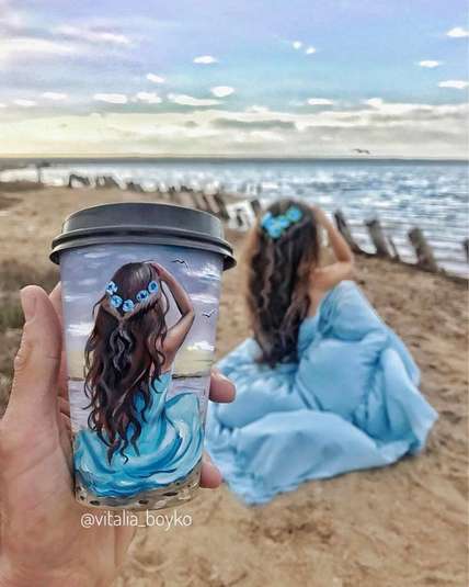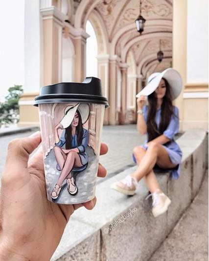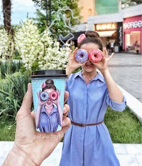 Художниця Віталія Бойко малює «автопортрети» на паперових стаканчиках і фотографується на їх фоні, точно відтворюючи зображення