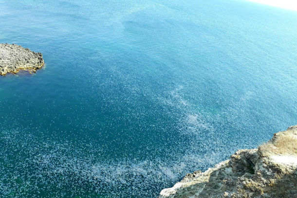 У Криму зграї медуз покрили всю поверхню акваторії мису Тарханкут. Їх так багато, що море змінило свій звичний колір і з висоти нагадує молочний кисіль, повідомляють відпочивальники. У море купатися не йдуть навіть найсміливіші.