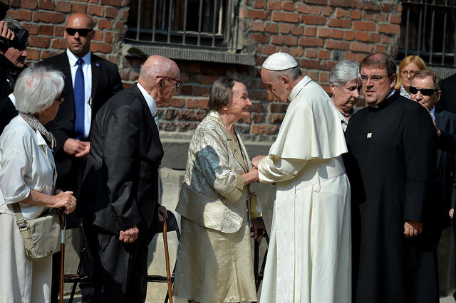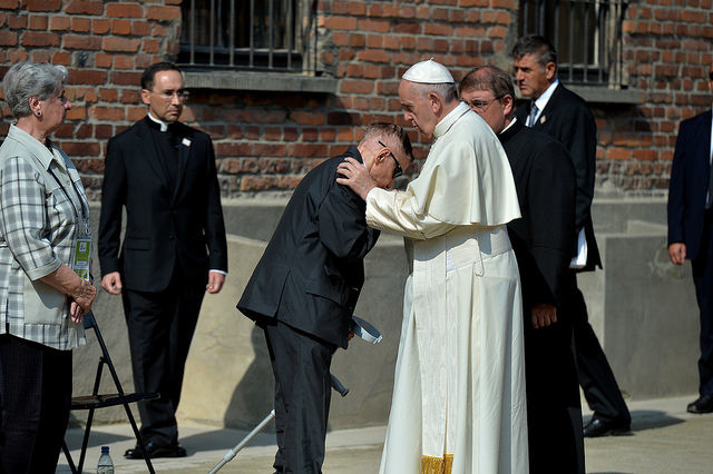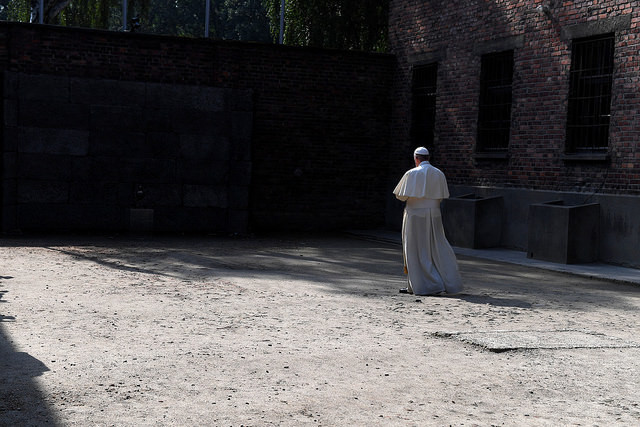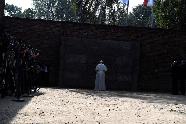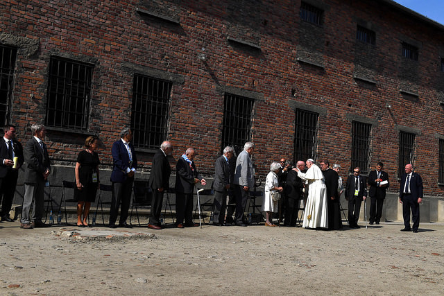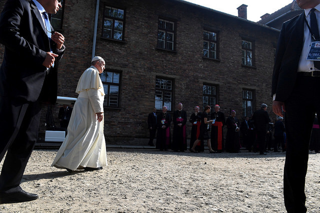 У музеї табору смерті «Освецім» понтифік на самоті близько десяти хвилин молився на лавці в тиші. Після цього папа Римський зустрівся з кількома колишніми в'язнями, які пережили Голокост, та запалив свічку біля «Стіни смерті», де нацистами були розстріляні тисячі ув'язнених.