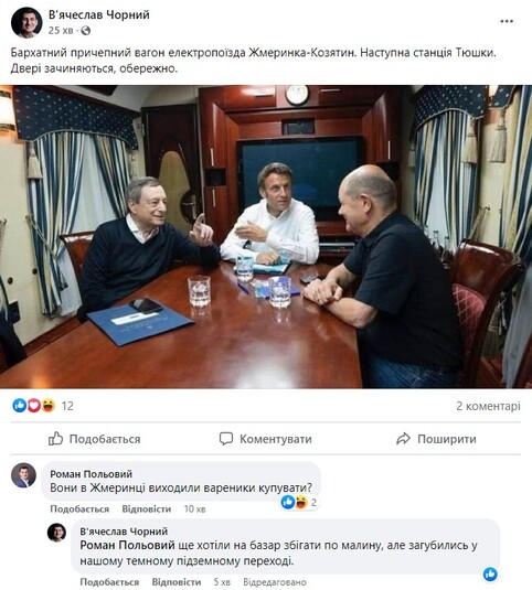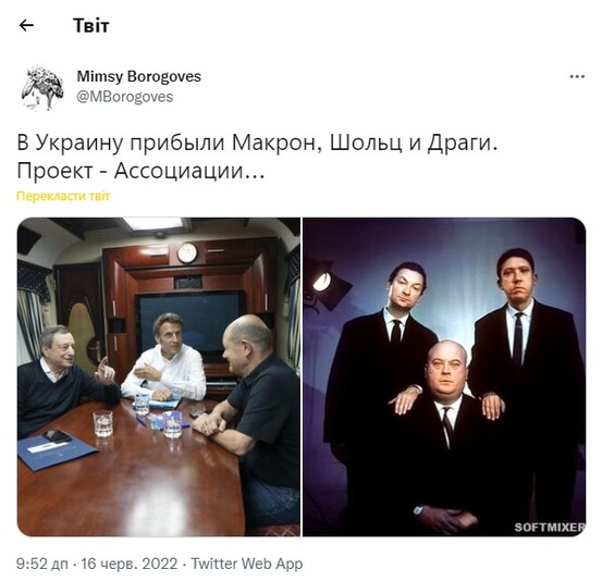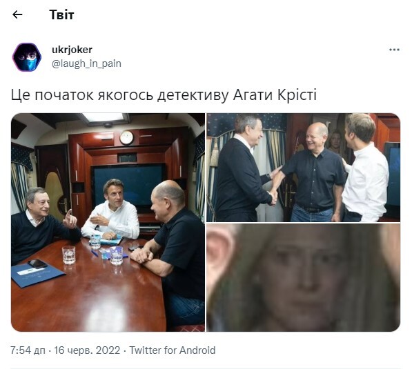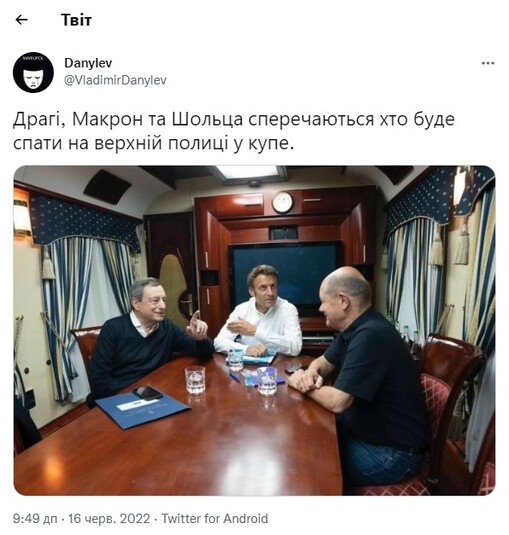 Фото із поїздки Драгі, Макрона та Шольца стало темою для жартів серед українців у соцмережах.