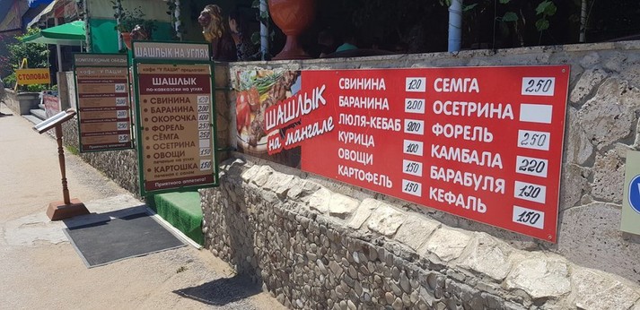 На знімки також потрапили актуальні ціни в кафе на півострові. Зокрема, кебаб коштує близько 200 рублів (83 грн), шашлик зі свинини - 120 (50 грн), а форель 250 рублів (104 грн) за 100 грамів.
