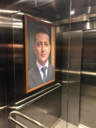 В ліфті телеканалу «Наш», який належить політику Євгену Мураєву, розмістили великий портрет президента України Володимира Зеленського. Відповідні світлини в соціальній мережі Facebook розмістив політолог Олег Лісний.