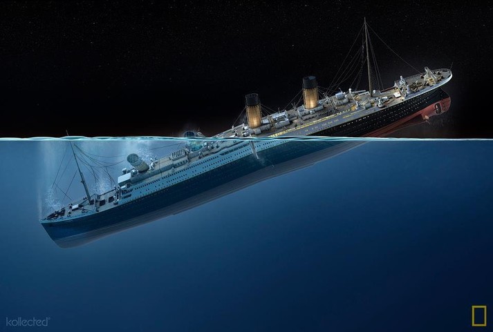 О 23:40 одному з матросів у «воронячому гнізді», Фредеріку Фліту, вдалося розгледіти великий айсберг по курсу корабля. Фліт швидко вдарив у дзвін та повідомив на капітанський місток. Отримавши новину, шостий помічник капітана Джеймс Муді і старший офіцер терміново вжили заходів – машинному відділенню було подано команду зупинити двигун і перевести обертання гвинтів у зворотному напрямку, штурвал було повернено ліворуч до кінця. Попри це кораблеві не вистачило відстані для повного повороту, щоб оминути айсберг, і він пробив обшивку вздовж борту. Ушкодив сталеві пластини нижче ватерлінії. Трюм затопило. Хоча помічник капітана Мердок і позакривав автоматичні люки між відсіками, через пошкодження борту було затоплено шість відсіків. До того ж перегородки не були суцільними і сягали тільки палуби Е.