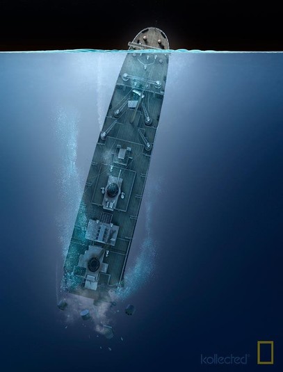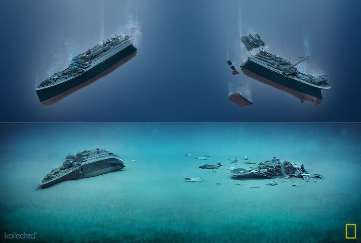 О 2:10 ночі вода в носовій частині заважила стільки, що почала занурювати ніс і піднімати корму з води. О 2:17 корма вже була піднята під кутом 45° і це призвело до обвалення димових труб і затоплення центральної частини лайнера через пробитий скляний купол. У цей час серед пасажирів почалася паніка: меблі, незакріплене устаткування почали перевертатися, згасло світло. Навіть масивні котли внизу не витримали навантаження і, відірвавшись, проломили декілька перегородок трюму. О 2:18 корпус корабля, не витримавши навантаження, розламався навпіл. Носова частина одразу пішла на дно. Кормова частина залишалася вертикально на плаву ще хвилину, і о 2:19 теж пішла під воду.