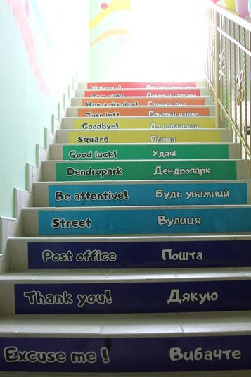 - мотивуючим простором - навіть сходи навчають англійської, а підлога - геометрії;