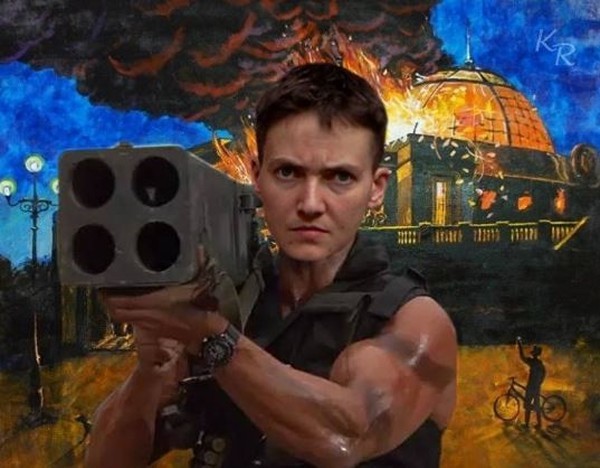 На одній з них Надія постає в образі командо з однойменного фільму з Арнольдом Шварценеггером, на інших - в образі Рембо. Також вистачає робіт, автори яких натякають на зв'язки Савченко з російською владою.