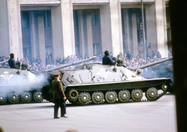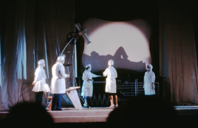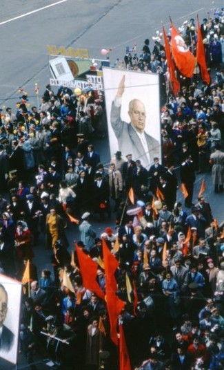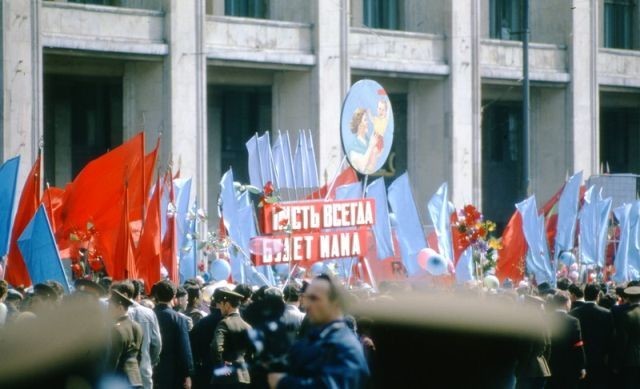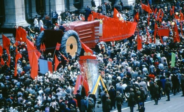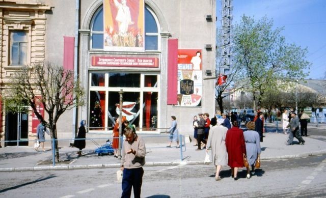Варто зазначити, що на цих світлинах особливо впадає в очі велика кількість різноманітних пропагандистських матеріалів тих часів: червоні прапори, цитати різноманітних комуністичних діячів та їхні портрети.