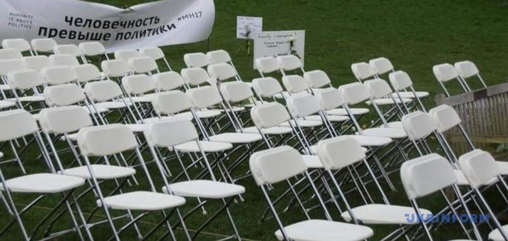 Як повідомляє власний кореспондент Укрінформу, рідні загиблих встановили навпроти посольства Росії у Гаазі 298 білих стільців, які символізують жертв трагедії. На борту знищеного літака було 196 громадян Нідерландів. Хвилиною мовчання усі присутні вшанували пам’ять загиблих.
