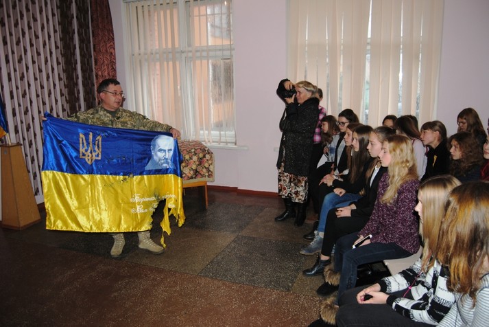 Військові розповіли дітям про Збройні Сили України, подвиги бійців АТО з Рівненщини, продемонстрували жовто-блакитний стяг, під яким військовослужбовці захищають Україну на передовій. Школярі цікавилися життям своїх однолітків на лінії розмежування сторін.
