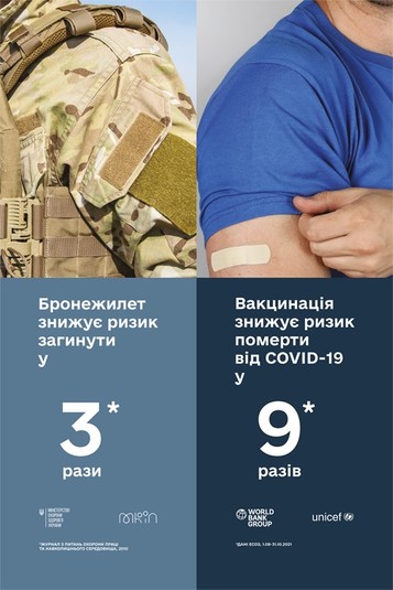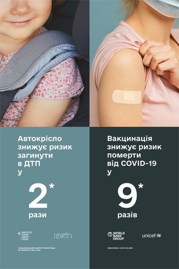 Одним із проявів інформаційної кампанії став соціальний ролик, який демонструє, що вакцинація рятує та захищає життя так само, як і звичні й відомі нам атрибути: дитяче автокрісло, бронежилет або ж будівельна каска. За даними Електронної системи охорони здоров'я, щеплення у дев'ять разів знижує ризик померти від коронавірусу.