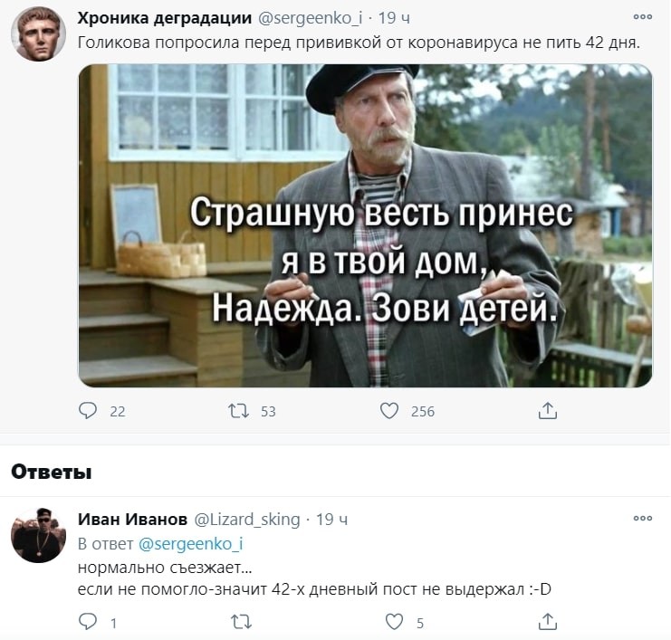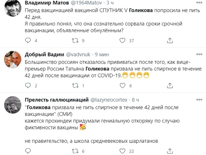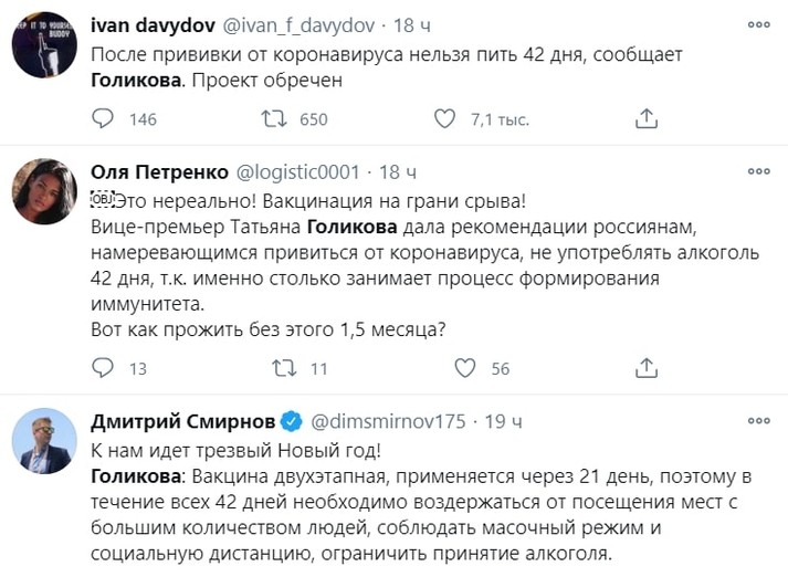 У мережі бурхливо відреагували на подібні вимоги після вакцинації російським експериментальним препаратом. Особливо користувачів інтернету розсмішила вимога не пити алкоголь, тим більше напередодні новорічних свят. Після цього в Twitter з’явилися чисельні меми, а люди висловлюють думку, що ідея заздалегідь «приречена на провал», «вакцинація зірвана», і що цією«геніальною відмазкою» можна буде потім пояснити неефективність вакцини «Спутник V» – мовляв, «не дотримались посту».