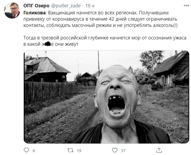 Російська вакцина від коронавірусу «Спутник V» буде ефективною тільки в разі дотримання ряду обмежень після використання. Зокрема це стосується вживання алкогольних напоїв протягом 42 днів після щеплення, – заявила віцепрем’єр Тетяна Голікова. Серед інших табу російська чиновниця назвала приймання ліків, які пригнічують імунну систему, а також відвідування людних місць.