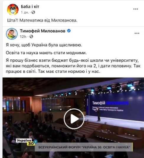 Ініціатива Володимира Зеленського, який оголосив про створення Президентського університету, викликала шквал гумору в соціальних мережах. Також від інтернет-жартівників дісталося і позаштатному раднику керівника Офісу президента України Тимофію Милованову, який запропонував бізнесу «взяти бюджет будь-якої школи чи університету, помножити його на 2, і дати половину».