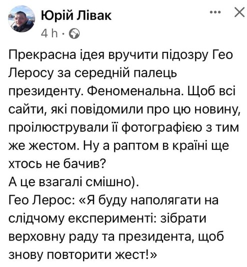 Нагадаємо, коментуючи підозру, Лерос заявив, що «інша думка» в державі Зеленського стає небезпечною для життя.