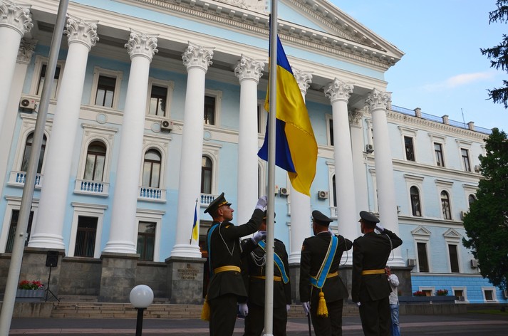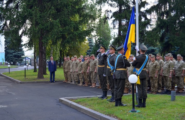 Під звуки Державного гімну України та салюту зі стрілецької зброї Державний прапор України було урочисто піднято на флагштоку перед будівлею оборонного відомства.