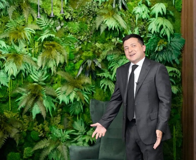 Зокрема, його стіни від підлоги до стелі прикрашені штучними джунглями, а позаду крісла Зеленського на стіні висить неоновий напис «Центр Дії Президента».