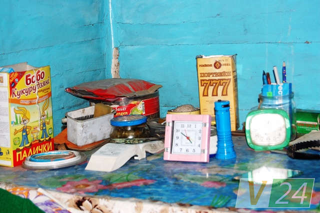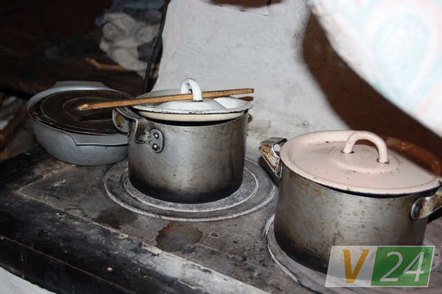 Грубка з кількома алюмінієвими каструльками. На столі - такі ж алюмінієві миски. Нехитрі наїдки. Під рукою - розгорнутий перекидний календар (з ним, певне, бабі Гані рахувати прожиті дні легше).