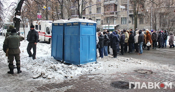 Сьогодні учасники протестних акцій повернулися на своє місце «роботи». Хоча з кожним днем їх стає все менше. Але не тільки учасників. Ще на акцію привезли тільки два (вчора було близько десятка) туалети, що викликало довгі черги. І склалося враження, що мітинг з під НБУ перемістився до вулиці Садової, де були розташовані тимчасові вбиральні.